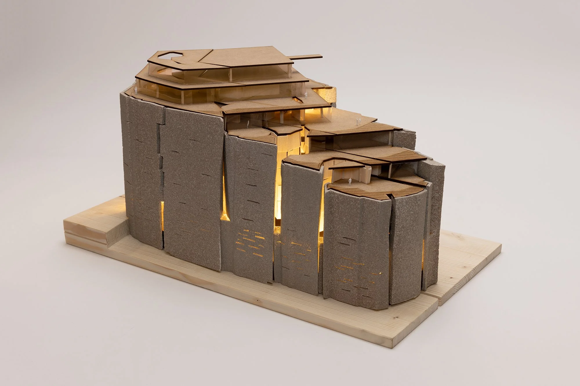 The spatial organisation follows rhythm rather than function. From stillness at the base to openness at the top, each level choreographs emotional states. Vertical voids carve through the building, guiding light and people alike, transforming floor plates into connected, layered experiences. The building becomes a rock-like mass shaped from within, holding silence, presence, and joy.